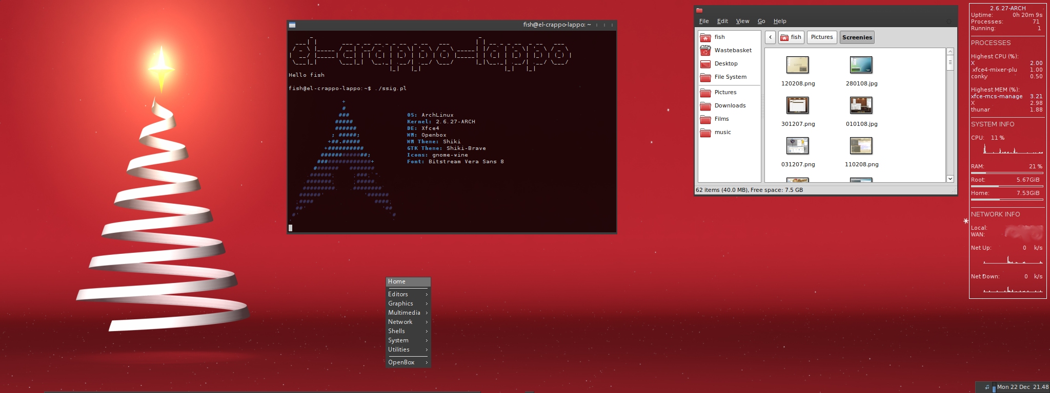Fish Posted December 22, 2008 Share Posted December 22, 2008 Archlinux Openbox, Xfce-panel, Thunar, Conky, Urxvt Merry Christmas! :D Link to comment Share on other sites More sharing options...