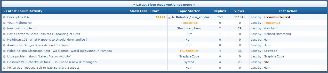 Guest GraphiteCube Posted December 25, 2008 Share Posted December 25, 2008 Hello. Please see the following picture: As you can see at the top of the page, one of the forum members is having a long name, and the thread placed under him/ her cannot be shown. I am using Mac OS X Tiger and Safari 3. May I know if it is my problem? It didn't bring me any problem, but just want to report it... :) Link to comment Share on other sites More sharing options...