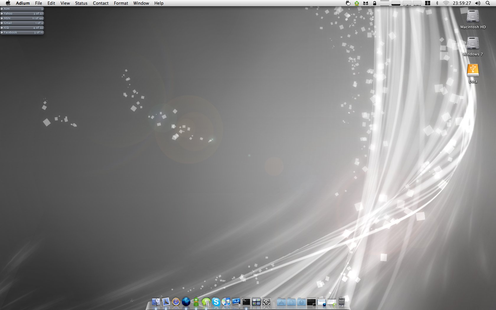 mattyfofatty Posted January 25, 2009 Share Posted January 25, 2009 wall please I can't find a download link... send me your email address and I'll get it to you Any way I can make my Vista desktop look like that? Specifically the bottom area of the desktop! :D Not sure... I've never really used Vista. I believe dragthing is available for Windows, so you might look into that (it's used for the dock in the bottom left). date/time is geektool, but I'm sure there is something for that in windows, maybe even just a widget that would require a bit of customizing. The mail icon is also a mod of an apple widget, but I'm sure you could fid a yahoo widget that would work. Link to comment Share on other sites More sharing options...