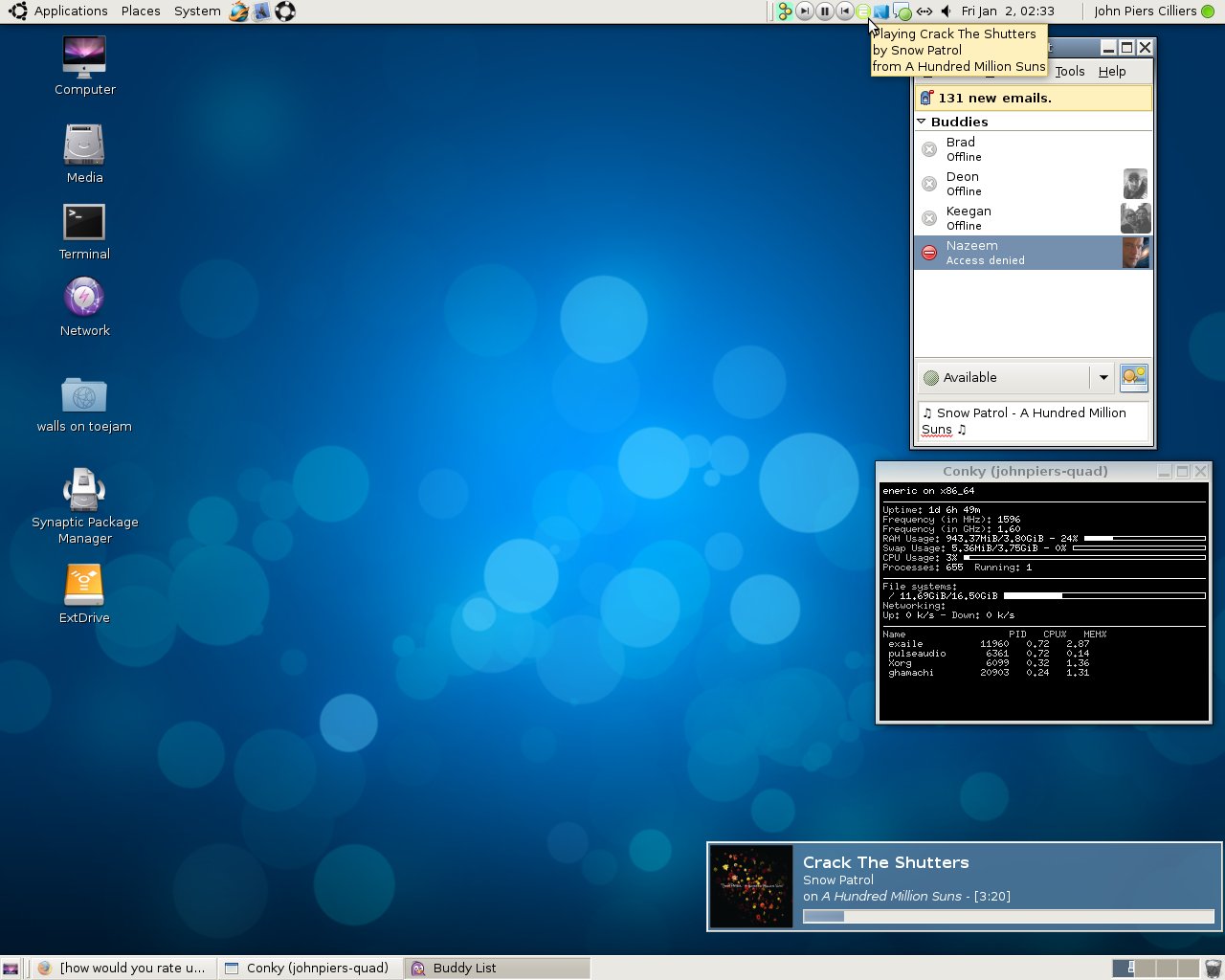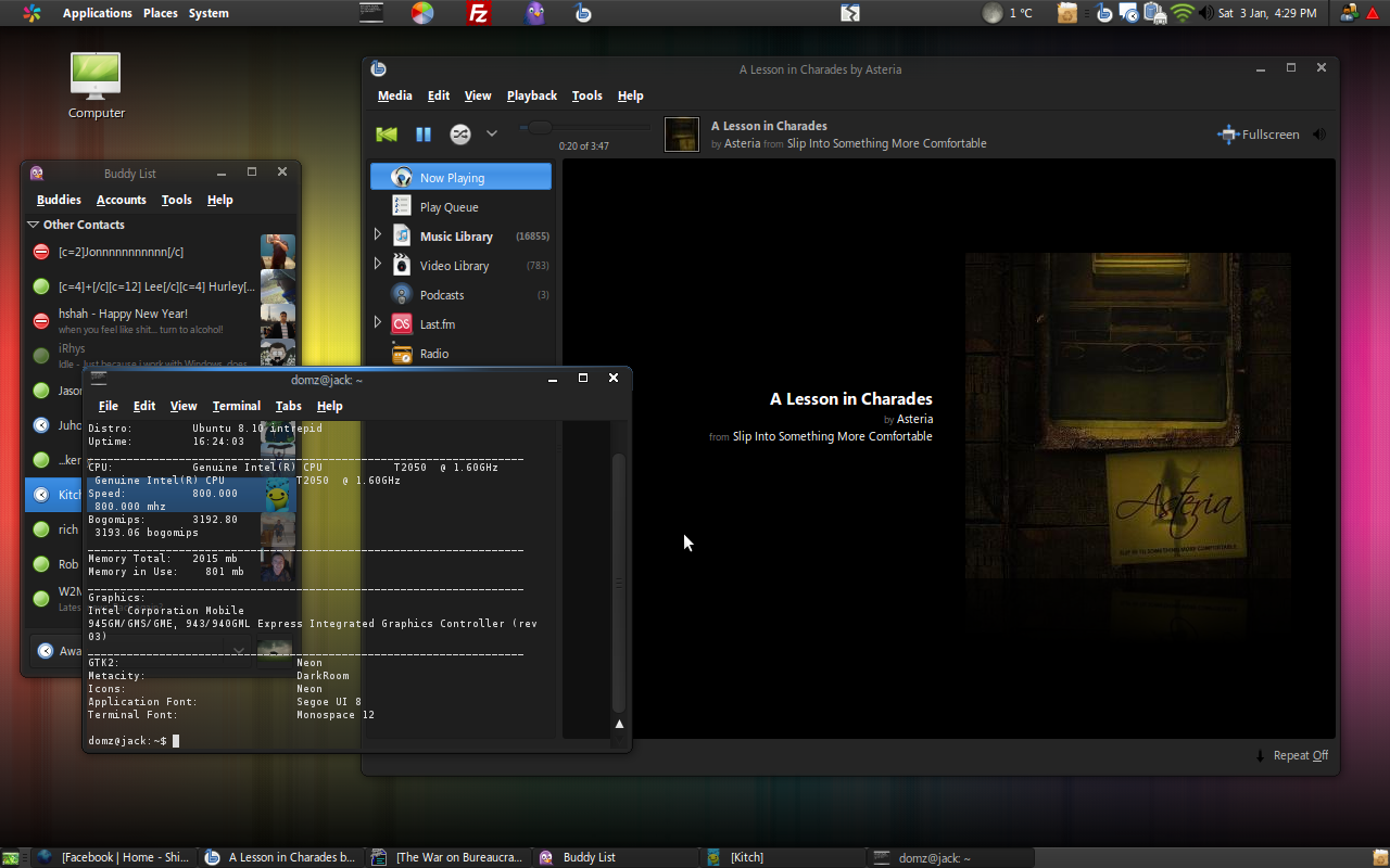 DomZ Posted January 3, 2009 Share Posted January 3, 2009 Looks like we're all loving that Neon theme Clean: Dirty (theme etc info in terminal window): Link to comment Share on other sites More sharing options...