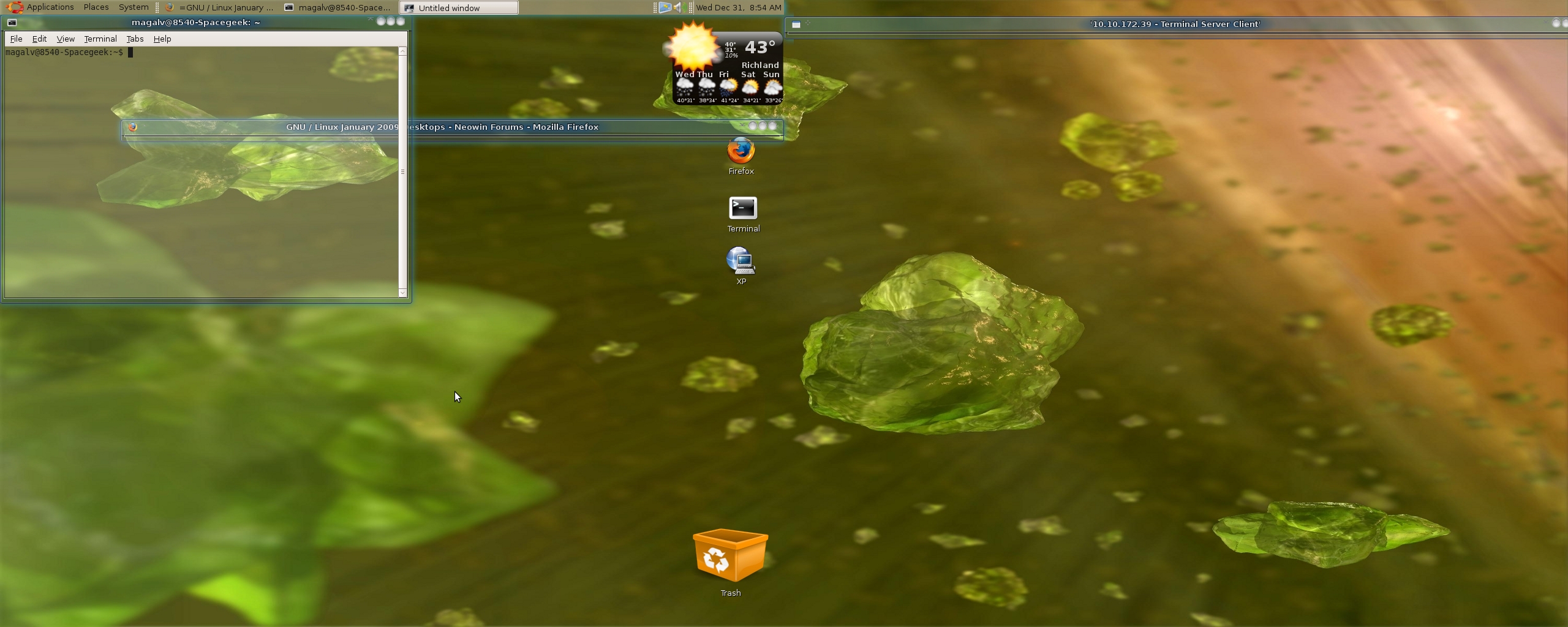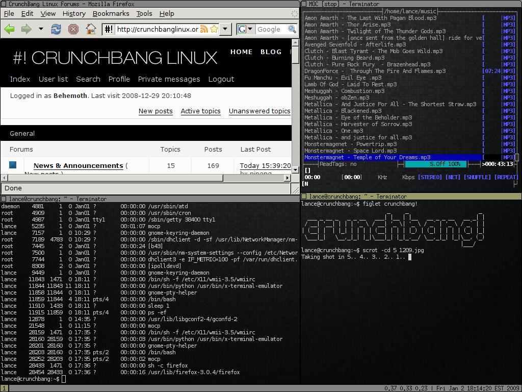 Barney T. Administrators Posted December 31, 2008 Administrators Share Posted December 31, 2008 GNU / Linux January 2009 Desktops - Posting Guidelines * If you plan to img-embed your desktop, please try to keep it under 100k (It's recommended that you link it, externally). * Stay within the board rules, no matter how yummy you may believe it to be. * If you are going to quote, there isn't a need to quote an img-embeded picture - Just don't do it. Please just reference the post by page number/page link/etc. * Off Topic Posts will be edited or removed. * The desktops thread is not to be used as a means to post images of a pornographic or otherwise provocative nature. We do not support a babes forum and neither will we in an unofficial capacity. Please help to keep the thread relevant and safe to browse for everyone. * The moderators of this forum reserve the right to edit or remove your posts as necessary so they may comply with our Community Rules. * In the interests of keeping the thread on topic it is strongly urged that you format your posts in the following order: Themes: Name/where you got it (with link would be nice). Wallpaper: Name/where you got it (with link would be nice). Icons: Name/where you got it (with link would be nice). Programs: Name/where you got it (with link would be nice). * Please use reduced-size thumbnails, where possible, out of respect for people running on lower bandwidth or screen resolutions. Important Note: Any image posted that is over 800 x 600 will be removed! Use a thumbnail or use a text link to your image. If your image is removed, this is why. Barney Link to comment Share on other sites More sharing options...