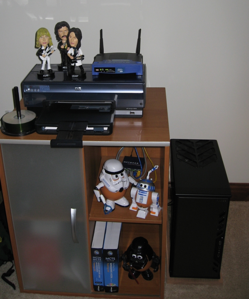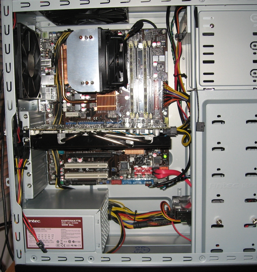 bob_c_b Posted January 1, 2009 Share Posted January 1, 2009 I changed out a lot of stuff in the last few months, a couple "cross grades" where I didn't really gain anything but some stability (was chasing a couple randrom crash bugs in my last set up that I narrowed down to hardware). This should keep me happy until the fall Intel refresh and we get a good look at what AMD has coming for this year as well... Inisde, not my usual super wiring job becasue the Antec 300 doesn't lend itself to that without some cutting, probably won't bother until I swap mobos again... The wife's PC, C2D e6400/2GB/GeForce 9500GT/Samsung T260/Vista x86... My little NOC with Windows Home Server in the mini P180 on the floor... Link to comment Share on other sites More sharing options...