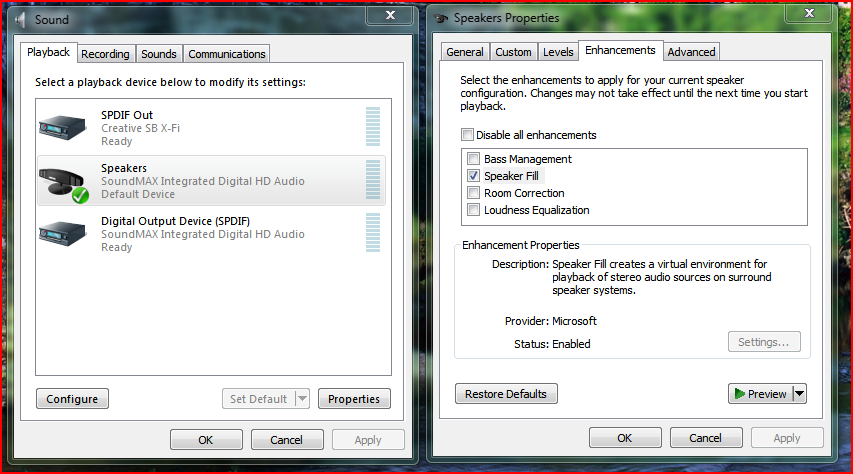 Unimatrix Xero Posted January 21, 2009 Share Posted January 21, 2009 Has anyone got a onbaord soundmax chip on there Windows 7 install?, im having to use mine due to my x-fi not working under window7. ive installed the software from my mobo's website but i cant get full 5.1 surround sound, i only appear to get 2.1 When i do the sound check in Sound manager, i get the test sounds but when i play music or games it only goes to 2.1 my mobo is the ASUS M2nVP-VM and it supports 5.1 Link to comment Share on other sites More sharing options...