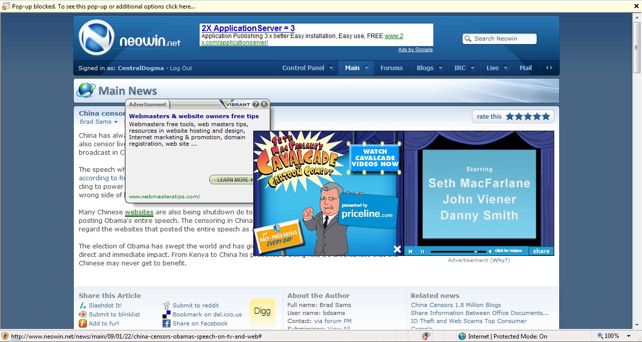 CentralDogma Posted January 22, 2009 Share Posted January 22, 2009 I'm alright with the Google ads and even the banner ads ("hit Bush with a pie!"), but your ads have gotten ridiculous. I've always been against the Vibrant ads and blocked them on my other computer. Now there's apparently an inline video, which has absolutely nothing to do with the news item, which protrudes over the news if you mouse over it. Now that I look, you also have pop-ups going too! I understand that you're trying to at least break even with operating costs, but you're slowly making the front page unusable and you're going to be driving away new members. Link to comment Share on other sites More sharing options...