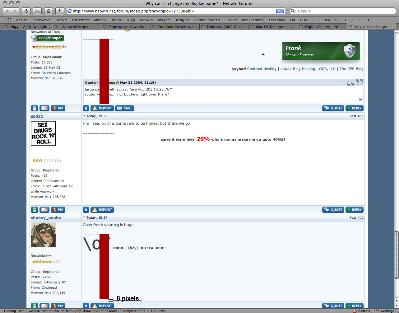 +Dick Montage Subscriber² Posted January 26, 2009 Subscriber² Share Posted January 26, 2009 Ok, so I am on 20% warn (recently reduced). Is this a reason I cannot change my display name? Whenever I try, I just get the generic error. Ta Link to comment Share on other sites More sharing options...