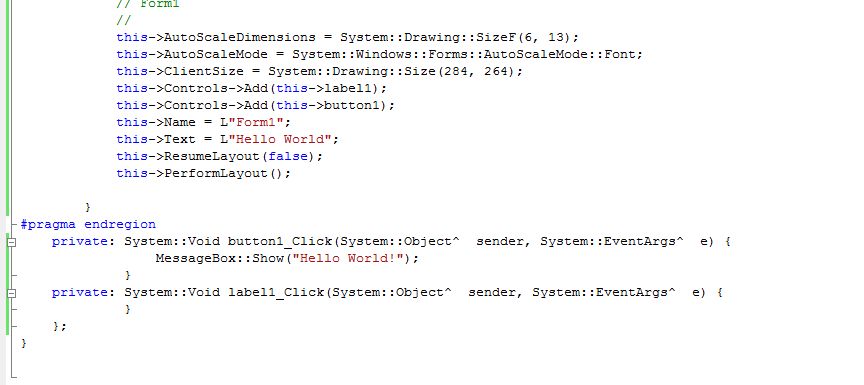 #pragma endregion private: System::Void button1_Click(System::Object^ sender, System::EventArgs^ e) { Messagebox.Show("Hello World!"); } };Link to comment
