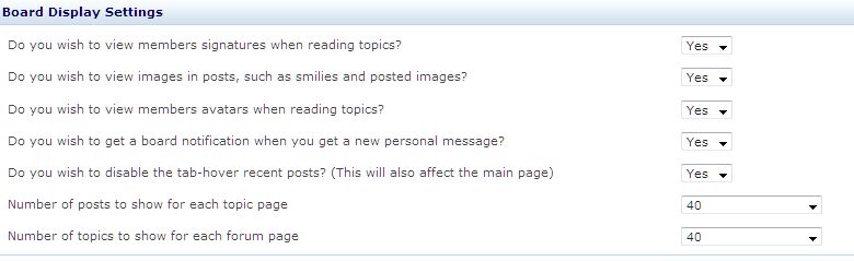 Andrew Lyle Global Moderator Posted March 16, 2009 Global Moderator Share Posted March 16, 2009 IF and it's a big IF there is another category added, such as less than < 80kb for externally hosted sigs, couldn't the devs hack in a new option to the control panel?Such as ? Just a suggestion, no idea how practical it is, but I'd of thought any mobile/dialup users would probably just disable sigs altogether to save on the loading. You can already Disable signatures, but no option for over 50KB etc etc.. but re-read what Fred said, it's being considered and he makes no promises Control Panel > Board Settings Link to comment Share on other sites More sharing options...
