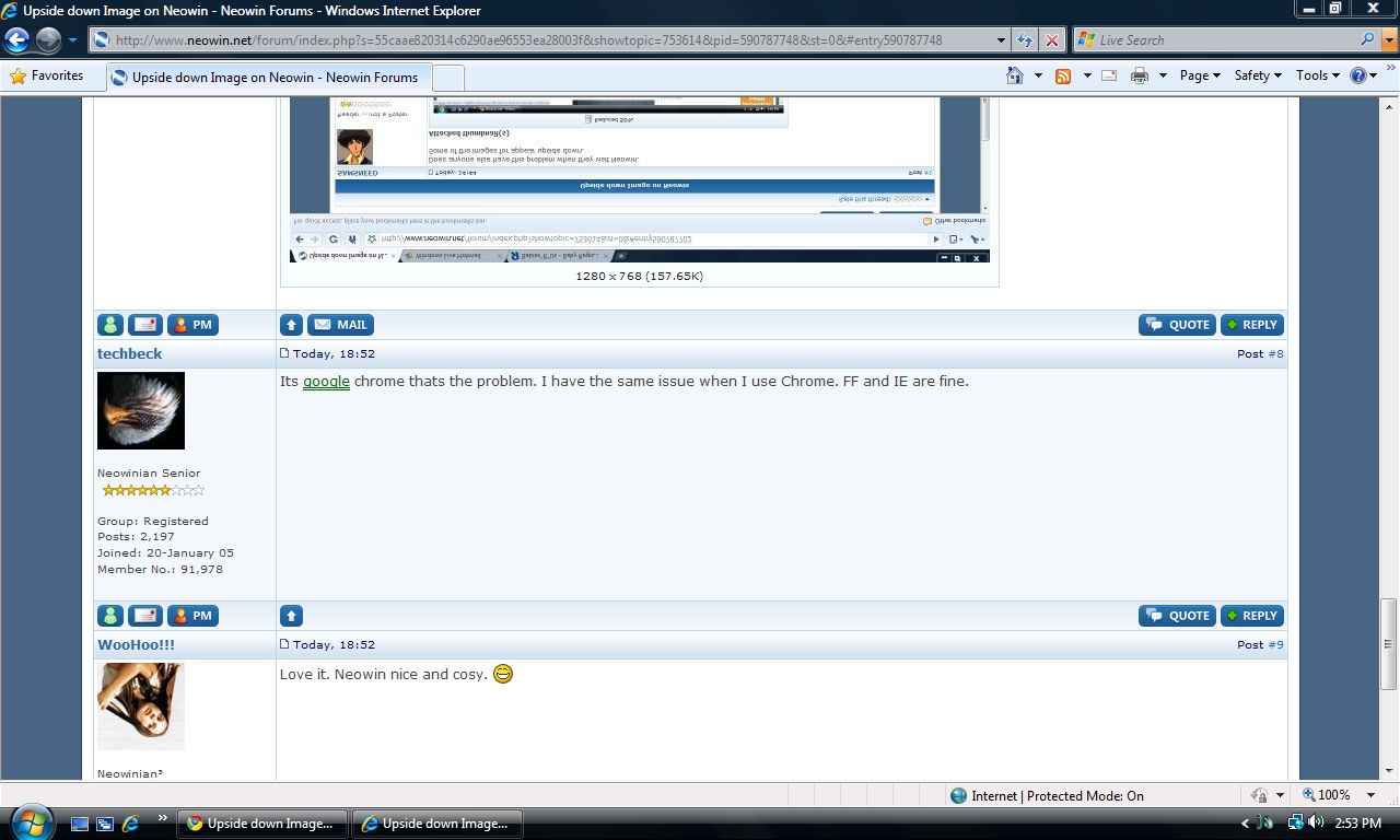 techbeck Posted March 31, 2009 Share Posted March 31, 2009 It's not Google Chrome being the problem. It's Neowin's developers having a warped sense of humour. Then why does IE and FF work without issue? I load the main page of Neowin with Chrome and get this....Not in FF or IE tho...maybe its just random? HAHA...N/M...just saw it with FF for the first time...my mistake :) Link to comment Share on other sites More sharing options...