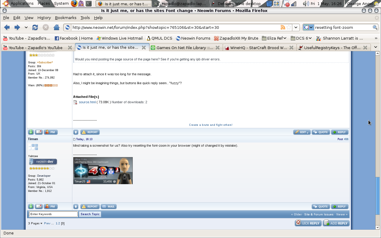 Zapadlo Posted May 1, 2009 Share Posted May 1, 2009 Every font here uses verdana for the content.Would you mind posting the page source of the page here? See if you're getting any ipb driver errors. Had to attach it, since it was too long for the message. Also, I might be imagining things, but buttons like quick reply seem.. "fuzzy"? source.html Link to comment Share on other sites More sharing options...