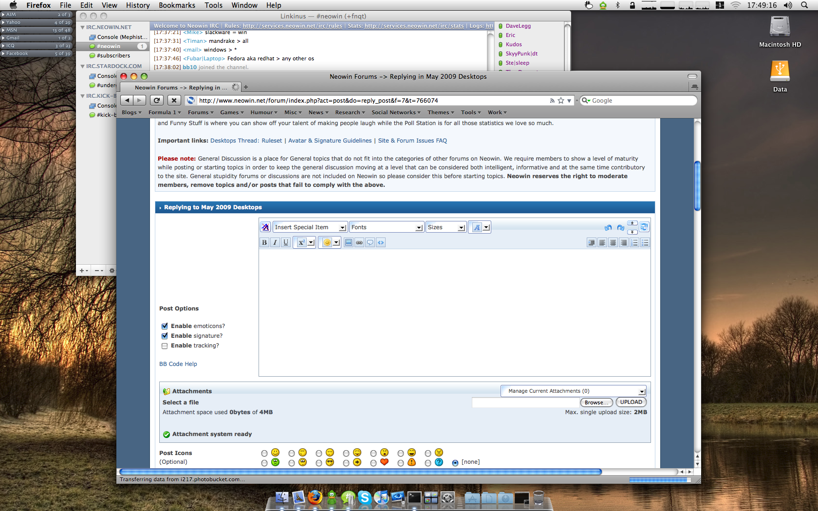 Nerve Posted May 1, 2009 Share Posted May 1, 2009 OS: XP SP3 VS: Ambient (custom mod) Bottom left small icons: Drives (My Computer, System, Documents, Music, Images, etc.) Big icons, middle: Most used programs Menu/Taskbar setup: all done natively through XP Weather: Rainlendar - custom mod of moxaweather (with tango icons) That has got to be the sexiest desktop ever, what program are you using to apply the visual style? :) Link to comment Share on other sites More sharing options...