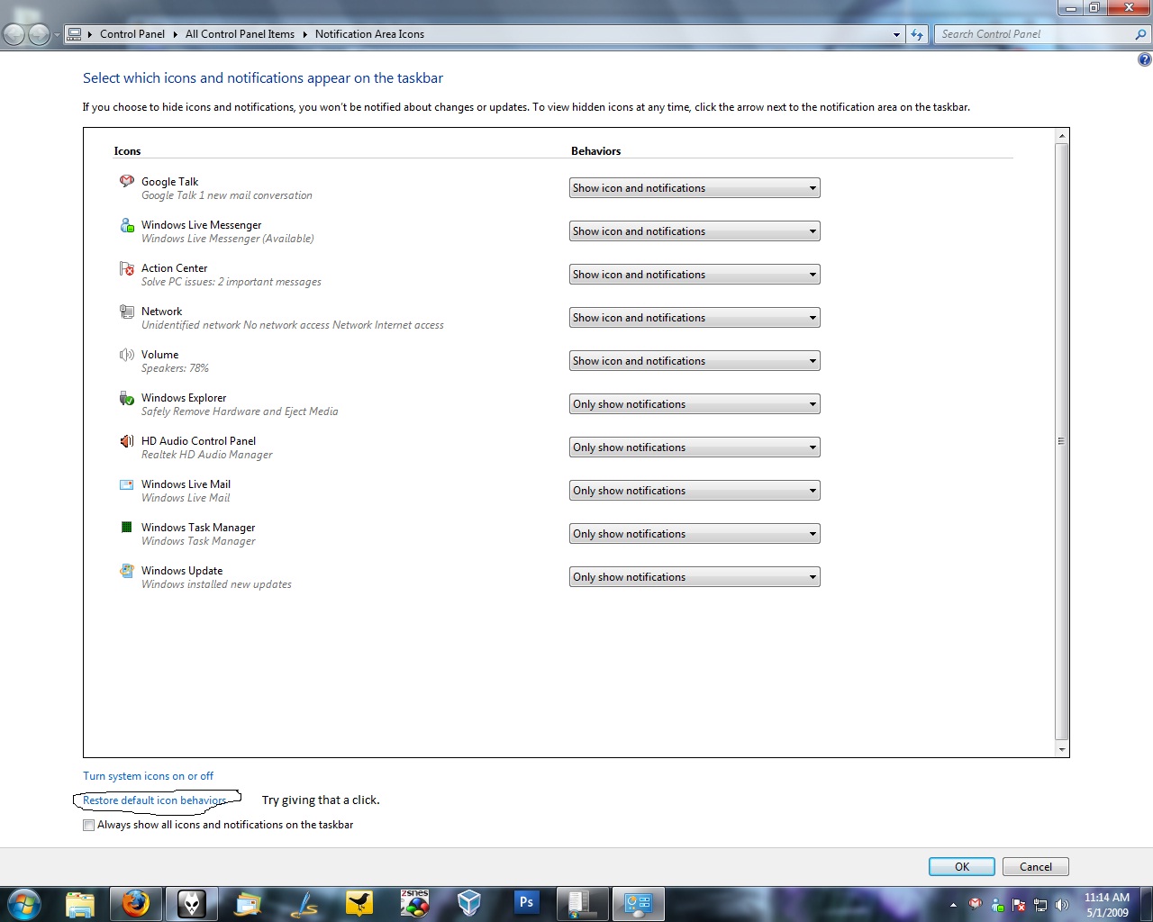 azz0r_wugg Posted May 1, 2009 Author Share Posted May 1, 2009 The restore in Notification Area settings has brought them back! Thanks. Still odd they went invisible though O_o and mega LOL! I never thought of that when I made it, honest :p Link to comment Share on other sites More sharing options...