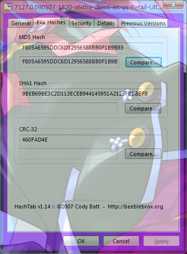 LiquidSolstice Posted May 15, 2009 Author Share Posted May 15, 2009 You've used the same MD5 hashes for the x86 and x64 builds. The x64 MD5 hash should be 98341AF35655137966E382C4FEAA282D ;) Ah, thank you so much :) Verified and fixed. Correct Hashes for 7100.0.090421-1700_x64fre_client_en-us_Retail_Ultimate-GRC1CULXFRER_EN_DVD.iso CRC32: 58FB2BE0 MD5: 98341AF35655137966E382C4FEAA282D SHA-1: FC867FE1AB2E0A9796F9E4D155B44EA6998F4874 SHA-1 verified and added, thank you! Link to comment Share on other sites More sharing options...