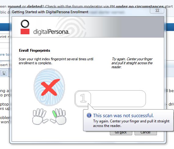 Zwinky Posted May 17, 2009 Share Posted May 17, 2009 Hi, I'm using a HP pavilion DV3630 as test device for W7 and want to use the fingerprint since I'll be putting work documents on it and want to protect them :) This laptop is using a validity fingerprint sensor the vfs201. I've installed the win7 software + drivers from the validity website and it shows up under control panel biometric devices just fine. The problem I'm having now is that I can't scan my finger. It keeps saying "this scan was not succesful". Anybody have any idea why it won't scan ? Franky Link to comment Share on other sites More sharing options...
