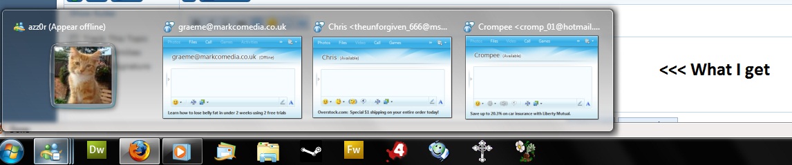 Calum Veteran Posted May 23, 2009 Veteran Share Posted May 23, 2009 Two pictures. In both I'd be hovering over the wlm icon.So as it is, when I hover over it, I get a bunch of window previews. What I would like is for every conversation to be up front. Okay, I see what you mean now - hovering over the thumbnail of the display picture brings up all conversations of that signed in Live ID, but hovering over each conversation thumbnail still brings up that one conversation? That would be nice, yes, but currently, I'd just hover over each conversation for the time being. The functionality you suggested doesn't provide that much use, right? It'd just be a nice touch to have? Also, your taskbar seems far from full with pinned programs. Is there a reason why you don't like having Messenger in the taskbar? Is it because you use a lot of programs at the same time and your taskbar overflows? Link to comment Share on other sites More sharing options...