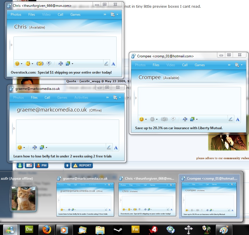 Calum Veteran Posted May 23, 2009 Veteran Share Posted May 23, 2009 Practically the way it works now is useless.I have 9 - 15 people pinging me on WLM letting me know what needs to be done. At the same time I'll be coding. I'll be browsing. I'll be doing alot of things. So for me, its highly unpractical to hover for a half second over msn, then look for the person i need to deal with, then mouse alll the way over if there on the far right, and then click it. Compared to the regular taskbar where I'd be them all flashing on the taskbar. In this respect, Windows 7 super taskbar is making my life more difficult. I still do not understand why you are only mentioning Windows 7 and only since the Windows Live Messenger icon has been in the taskbar. What you describe is how Windows Live Messenger has always worked with Windows, since Windows XP. In Windows XP and Windows Vista the conversations are grouped, by default, if you have that many conversations open. In Windows 7 they are grouped, by default, all the time. In all three versions of Windows you have to hover over the group and select the conversation. We say "hover", but let's face it, you don't have to hover, you can just click. In all 3 versions of Windows you can tell which conversation is which by the text label once you have clicked on the group. Windows 7 actually makes distinguishing between the conversations easier than previous versions of Windows because of aero peek - you can hover over each conversation to see which is which before clicking on them. If you wish for Windows Live Messenger to not behave like this, you can turn grouping off in all 3 versions of Windows. Having said all that, I am still confused as to what your problem is? Also, I am still confused as to why you state that only Windows 7 has this "problem"? but I do think that WLM v9 sucks balls. Ahh, that's the first time I've heard that someone hates it :o Any reason? I think it's a major improvement. Link to comment Share on other sites More sharing options...