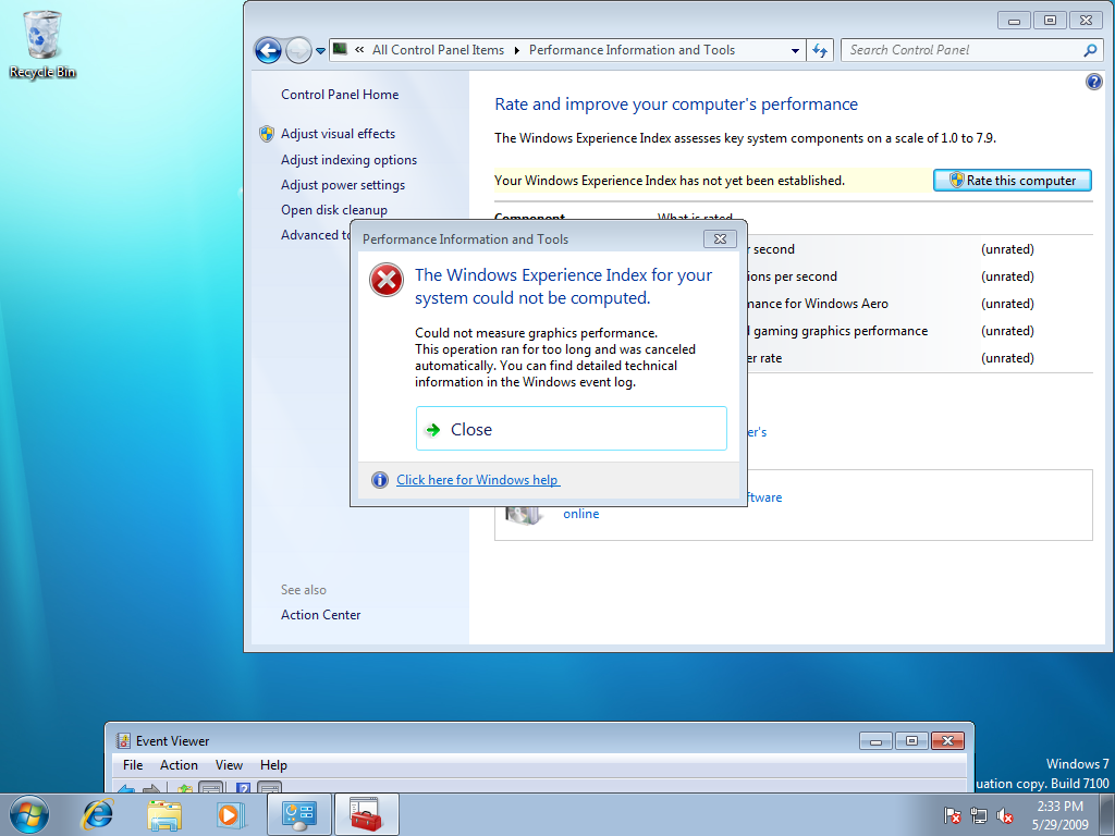 Frank Posted May 29, 2009 Share Posted May 29, 2009 I installed 7 RC on a old Compaq SR1811NX. I tried to run the WEI and I get the following error. I originally tried to run it on the integrated Express 200 video card but I got an error. I researched the error and found that some users fixed it by deleting the "DataStore" folder. I tried to do this and no dice. I then installed a X300 PCI-E card and I still got the attached error. I tried finding more information listed in the EventLog but I could not. Any idea on how to fix this? Link to comment Share on other sites More sharing options...