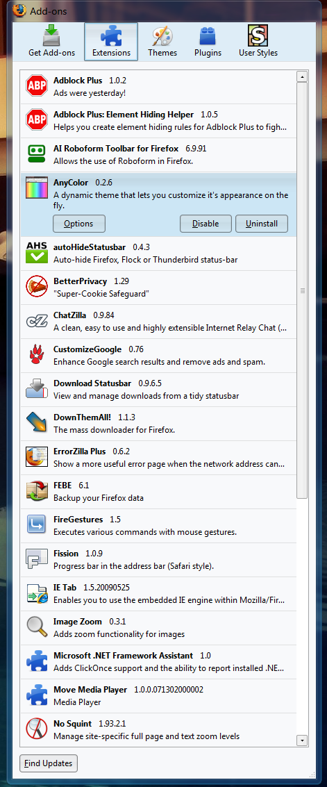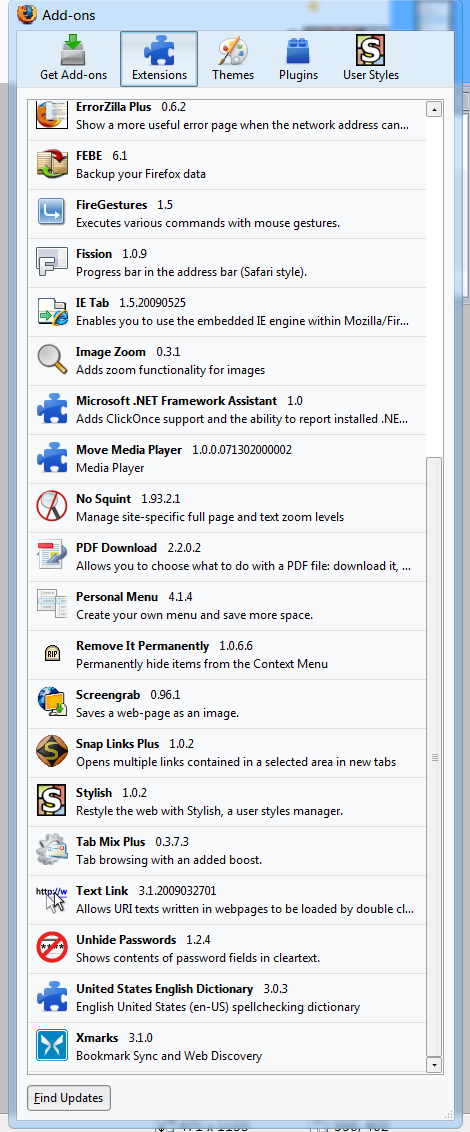 deletedxyz Posted June 11, 2009 Share Posted June 11, 2009 (edited) wall pleaseand could you share the info of your firefox modifications? Here's the wall: 16:10 version - http://suigintou.desudesudesu.org/4scrape/...view/340972.jpg 4:3 version - http://suigintou.desudesudesu.org/4scrape/...view/278845.jpg Regarding my Firefox modifications, it's quite a long list. Aesthetics-wise, I'm using the default Firefox theme for Vista (the alternative themes are too tiny to use for a 1920x1200 resolution). However, I'm using a custom toolbar background using the "AnyColor" Firefox addon. Here's are pics of my extensions and stylish themes you might be interested in: great desktop?is that windows 7? if not , which theme is it? how'd you change the start button? Nope, it's not Windows 7. I have posted my laptop specs in my sig. I'm using Windows Vista Ultimate x64. I'm using a custom visual style called Skulls that you can find here: http://bubito.deviantart.com/art/Skulls-78519353 Edited June 11, 2009 by maskedforever Link to comment Share on other sites More sharing options...