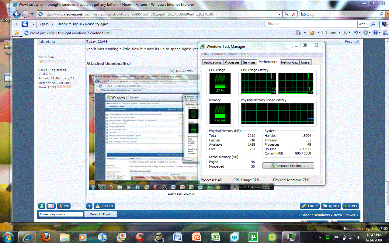 ajua Posted June 15, 2009 Share Posted June 15, 2009 As in Vista, the more RAM cached the better. People still are thinking XP when things in the OS have changed. This screenshot shows the RAM usage in my test laptop with RC Build 7100. Only WLM, Firefox and Windows Explorer are running. Link to comment Share on other sites More sharing options...