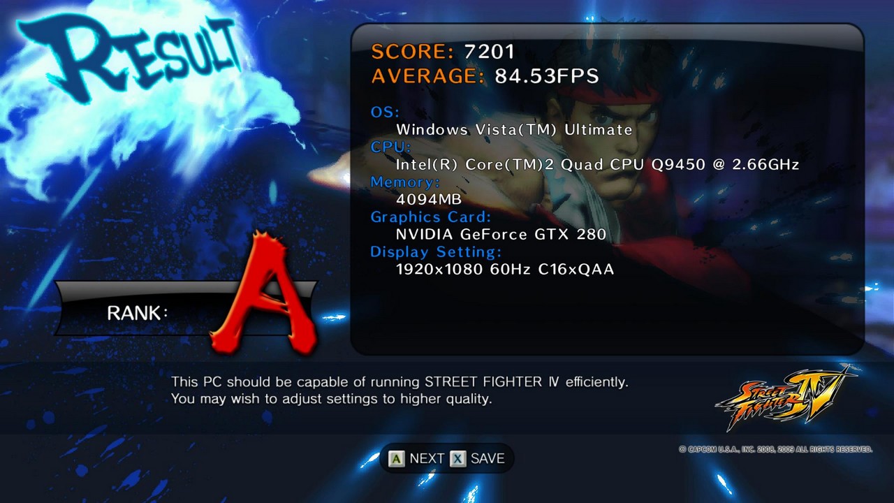 Unimatrix Xero Posted June 15, 2009 Share Posted June 15, 2009 (edited) Capcom have released a Benchmark tool so users can see how Street Fighter 4 for the PC will run when its release shortly, im not 100% on a release date atm, but i guess its sometime soon Benchmark tool can be downloaded from Gamershell.com http://www.gamershell.com/news_78322.html andit weighs in at just over 380mb. Just ran benchmark tool on my system and i got an average of 59.88fps, at 1680x1050 and i ran 2 passes Edited June 15, 2009 by Unimatrix Xero Link to comment Share on other sites More sharing options...