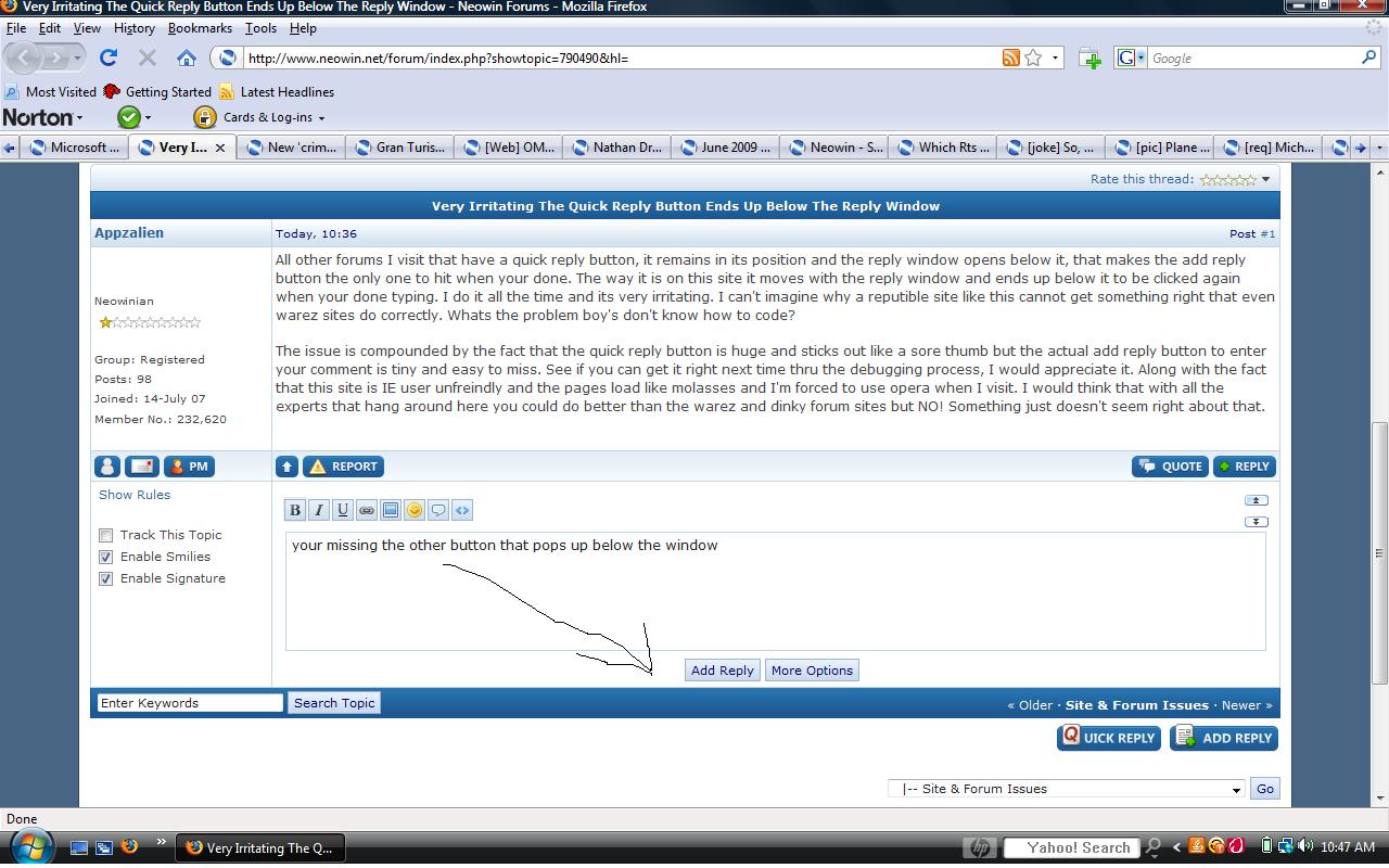 Appzalien Posted June 28, 2009 Share Posted June 28, 2009 All other forums I visit that have a quick reply button, it remains in its position and the reply window opens below it, that makes the add reply button the only one to hit when your done. The way it is on this site it moves with the reply window and ends up below it to be clicked again when your done typing. I do it all the time and its very irritating. I can't imagine why a reputible site like this cannot get something right that even warez sites do correctly. Whats the problem boy's don't know how to code? The issue is compounded by the fact that the quick reply button is huge and sticks out like a sore thumb but the actual add reply button to enter your comment is tiny and easy to miss. See if you can get it right next time thru the debugging process, I would appreciate it. Along with the fact that this site is IE user unfreindly and the pages load like molasses and I'm forced to use opera when I visit. I would think that with all the experts that hang around here you could do better than the warez and dinky forum sites but NO! Something just doesn't seem right about that. Link to comment Share on other sites More sharing options...