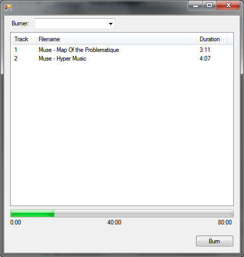 I'm trying to stick to regular controls (this will be a tiny, self-contained native Win32 executable), so the progress bar isn't great yet, but it seems to get the job done. The location of the burner dropdown is a bit suspect, though it looks more strange at the bottom of the dialog. I'm trying to make the interaction flow from top to bottom. I'm just not sure if burner selection is something that one would expect to do before or after adding tracks.