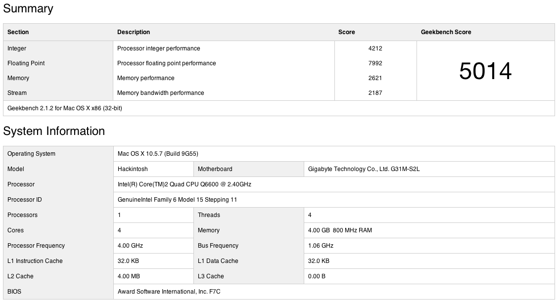 Death Proof Posted July 26, 2009 Share Posted July 26, 2009 Here is my Geekbench Intel Core 2 Quad Q6600 - 3.00GHz Gigabyte G31m S2L Motherboard nVidia 9600GT 512mb Kingston 4Gb RAM DDR2 so this is nothing revolutionary but everything works on it & it still gets the work done :) Link to comment Share on other sites More sharing options...