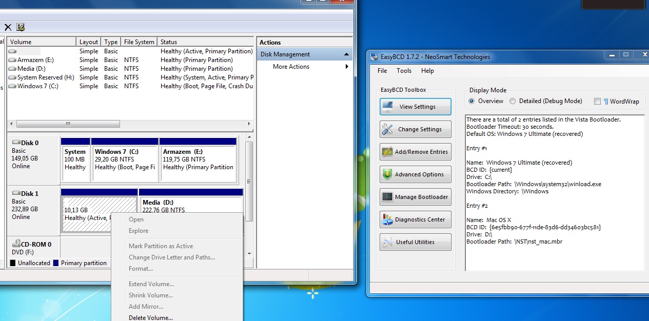 ProiektHat Posted July 24, 2009 Share Posted July 24, 2009 (edited) hi there.ok here is my doubt: i have 2 hdd:hdd0 and hdd1 hdd0 is partitioned in two parts :one for windows 7 ,the other for storage hdd1 is partioned in two parts :one for mac os x, other for storage. i have used Itakos v7 to install mac os x and used xiezhy bootloader, this bootloader don?t give me any chooses to boot from, except mac os x. right now i have to go to bios and change the order of hdd to boot to windows or to boot to mac os x...it?s quite annoying.win 7 bootloader doesn?t recognise mac osx nor easybcd. would someone give directions or advices to dual boot without having to go through all the process in bios. thanks so much. my specs mobo intel dp965lt (chipset p965/g965) processor quad core q8200 @2.3mhz nvidia 9600 gt 4 gb ddr2 800 hdd0 samsung 160 gb sata hdd1 seagate 230 gb sata heatsink artic freezer 7 pro Edited July 24, 2009 by Rilkeanheart Link to comment Share on other sites More sharing options...