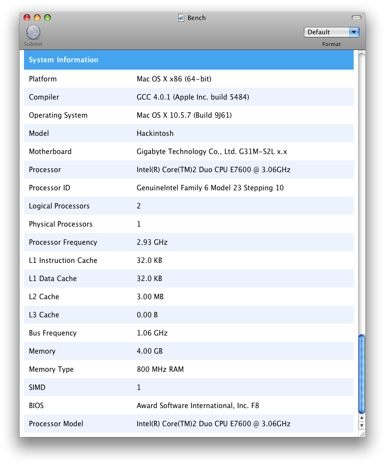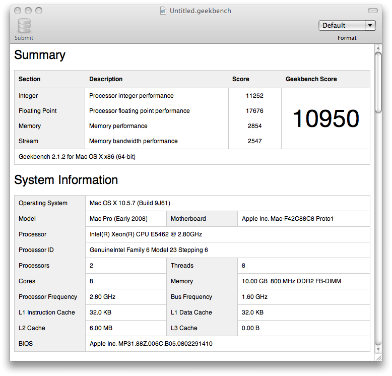 Death Proof Posted July 30, 2009 Share Posted July 30, 2009 Hiya folks, if any you you guys wanna share your Geekbench or X-Bench results. Then let this be the place for it . Here are my results , running on a Q6600 (3GHz) with 4Gb of RAM I wonder if this is as good as a early 2008 Mac Pro Link to comment Share on other sites More sharing options...