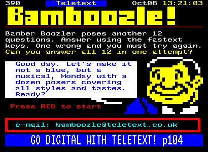DrCheese Posted September 23, 2009 Share Posted September 23, 2009 (edited) Teletext pff Teletext already has bamboozle! It needs nothing else! Shame it will die when analogue goes :( Fear bamber. Edited September 23, 2009 by DrCheese Link to comment Share on other sites More sharing options...