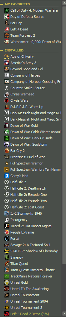neo158 Posted February 23, 2010 Share Posted February 23, 2010 These are the one I have installed and thats not including the games that aren't installed either via steam or the media. Link to comment Share on other sites More sharing options...