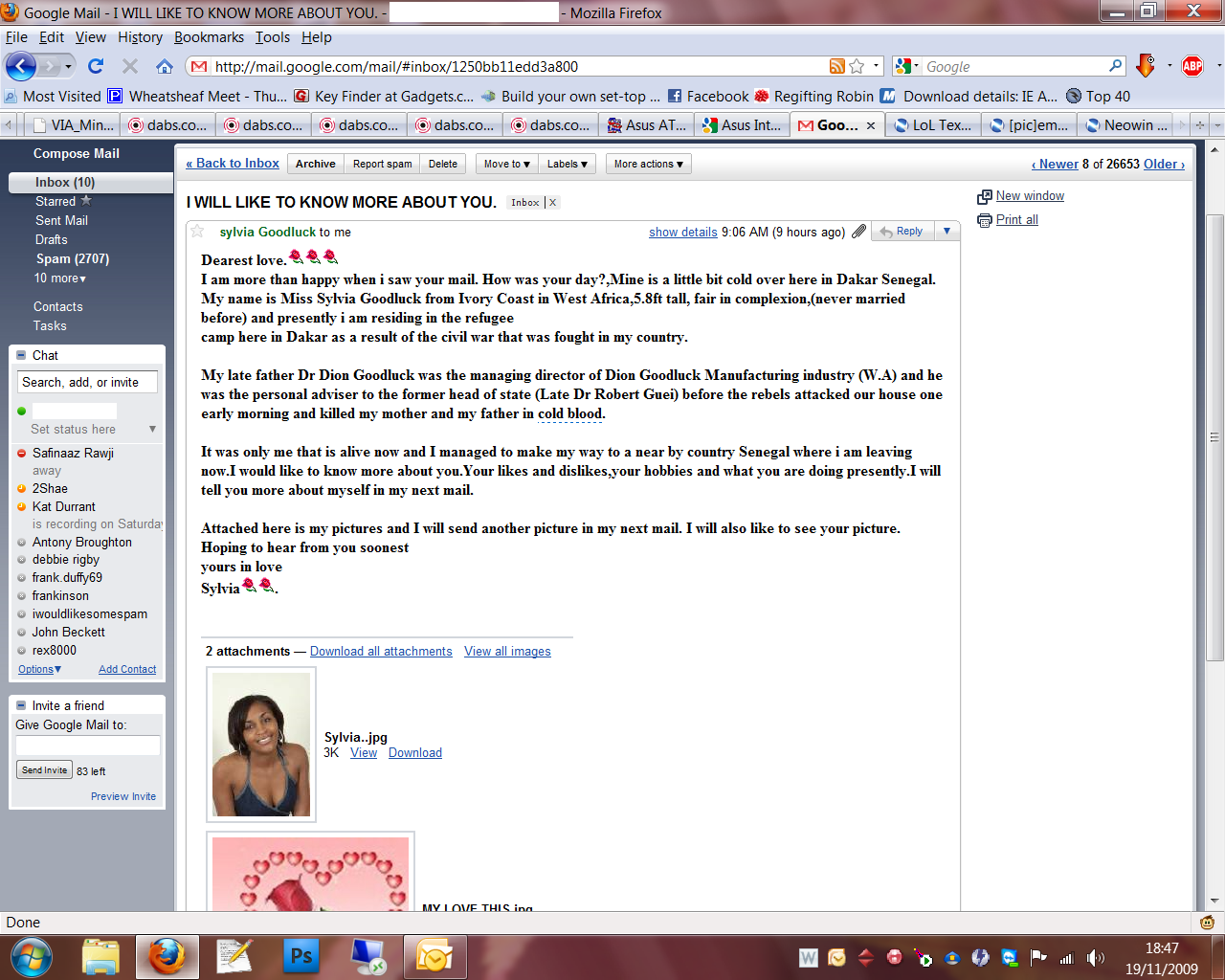 -Alex- Posted November 19, 2009 Share Posted November 19, 2009 (edited) Here's her reply: Dearest love.I am more than happy when i saw your mail. How was your day?,Mine is a little bit cold over here in Dakar Senegal. My name is Miss Sylvia Goodluck from Ivory Coast in West Africa,5.8ft tall, fair in complexion,(never married before) and presently i am residing in the refugee camp here in Dakar as a result of the civil war that was fought in my country. My late father Dr Dion Goodluck was the managing director of Dion Goodluck Manufacturing industry (W.A) and he was the personal adviser to the former head of state (Late Dr Robert Guei) before the rebels attacked our house one early morning and killed my mother and my father in cold blood. It was only me that is alive now and I managed to make my way to a near by country Senegal where i am leaving now.I would like to know more about you.Your likes and dislikes,your hobbies and what you are doing presently.I will tell you more about myself in my next mail. Attached here is my pictures and I will send another picture in my next mail. I will also like to see your picture. Hoping to hear from you soonest yours in love Sylvia. I'd attach the image but it's no bigger than what's on the screenshot - check the filesize, 3kb :p And my reply: Dearest love.I feel so sorry about your father and your mother - (not Celine Dion is it?). I actually met president Abdoulaye Wade whilst advising him on how best to farm rats for a new milk he is launching my rat milk brand (Squeaky Farms Brand Genuine Animal Milk) in Senegal - have you tried it? It's delicious! You see, I think we have a lot in common as my late father was the managing director of Squeaky Farms Brand Genuine Animal Milk but he and my mother were killed by some rats that broke free from their cages in cold blood. My interests and hobbies include milking rats, drinking rat's milk and pouring rat's milk all over naked ladies' breasts and pretending that they're rats. How about you? Would you let me pour rat's milk all over your breasts and pretend you're a rat? Tell me more about you and send me some more photos! Hoping to hear from you soonest yours in love . Oh and 'Squeaky Farms Brand Genuine Animal Milk' is the name of Fat Tony's milk farm on the Simpsons. :p Edited November 19, 2009 by -Alex- Link to comment Share on other sites More sharing options...
