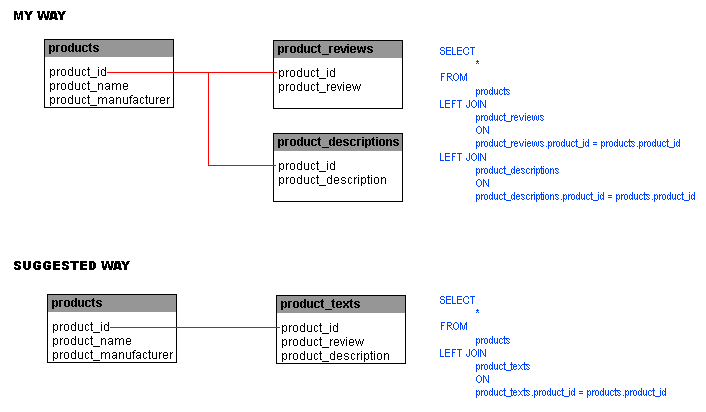 My way involves a main product table, with a table each for description and internal_review, both joining against a common product_id field.