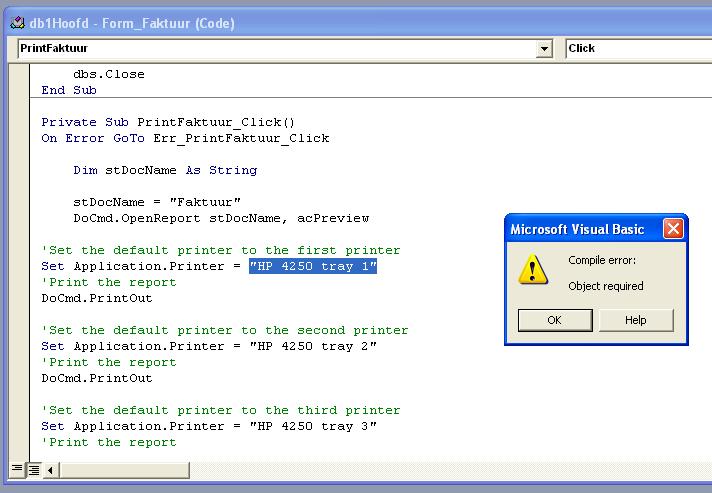 Does it highlight any line of code? You did replace the form name with the name of the form you are trying to print? Otherwise I don't really know.