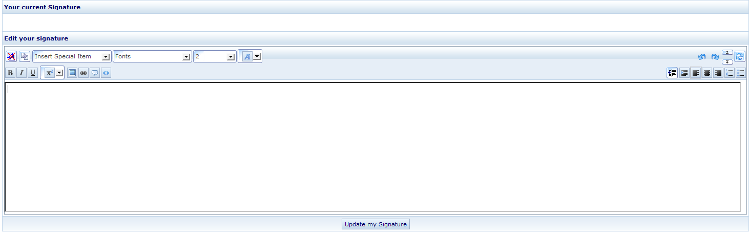 DaveLegg Developer Posted January 2, 2010 Developer Share Posted January 2, 2010 This is what I see when I go to edit my signature: It's possible, as you're not seeing it yourself either, that there is some issue for you loading those images. If you are using the RTE, then it would appear blank. Click the icon on the top right (Looks somewhat like a refresh icon) to switch to the standard editor, and see if that helps? Link to comment Share on other sites More sharing options...