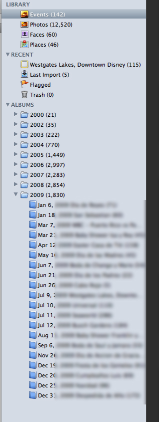 KoL Veteran Posted January 2, 2010 Veteran Share Posted January 2, 2010 (edited) This is what I do. I have a folder for each year, inside the folder I have the albums with date and name of the event. When I started to use iPhoto I moved the each event from the folders to the iPhoto album. In Events sometimes I had two or more events for the same album, I just merged them and name it. Took me a while to get everything organized, events, places etc. but i really like how it is organized. Here is a pic of how it looks. When I want to upload an album to Facebook I don't use the Facbook thing on iPhoto. I just export the album to a folder on the desktop (smaller size for the photos since facebook resize them) and when I upload them I delete them. Edited January 2, 2010 by KoL Link to comment Share on other sites More sharing options...