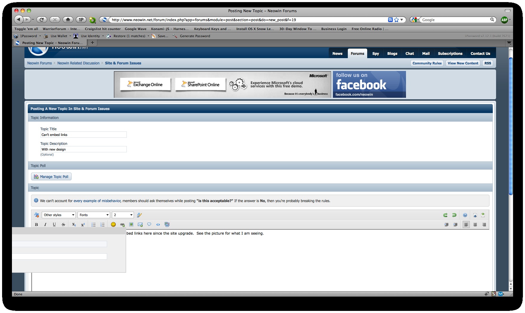 PNWDweller Posted January 28, 2010 Share Posted January 28, 2010 I am using Firefox 3.6 on my Mac and unable to embed links here since the site upgrade. See the picture for what I am seeing. The same applies to Youtube links. Any ideas? Plugins used are: 1Password Adblock Plus (Not here though. :) ) DownloadthemAll Firebug Stylish Web Of Trust Tineye Xmarks Link to comment Share on other sites More sharing options...