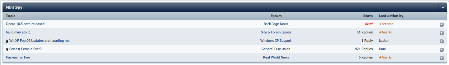 carmatic Posted February 26, 2010 Author Share Posted February 26, 2010 Were there 10 topics on the old mini spy or 5? ?It will also never be 10 entries, we dropped the ability to expand it to 10 due to the fact that we have a full spy now, mini spy does exactly what it is intended for, a reduced full spy. Link to comment Share on other sites More sharing options...