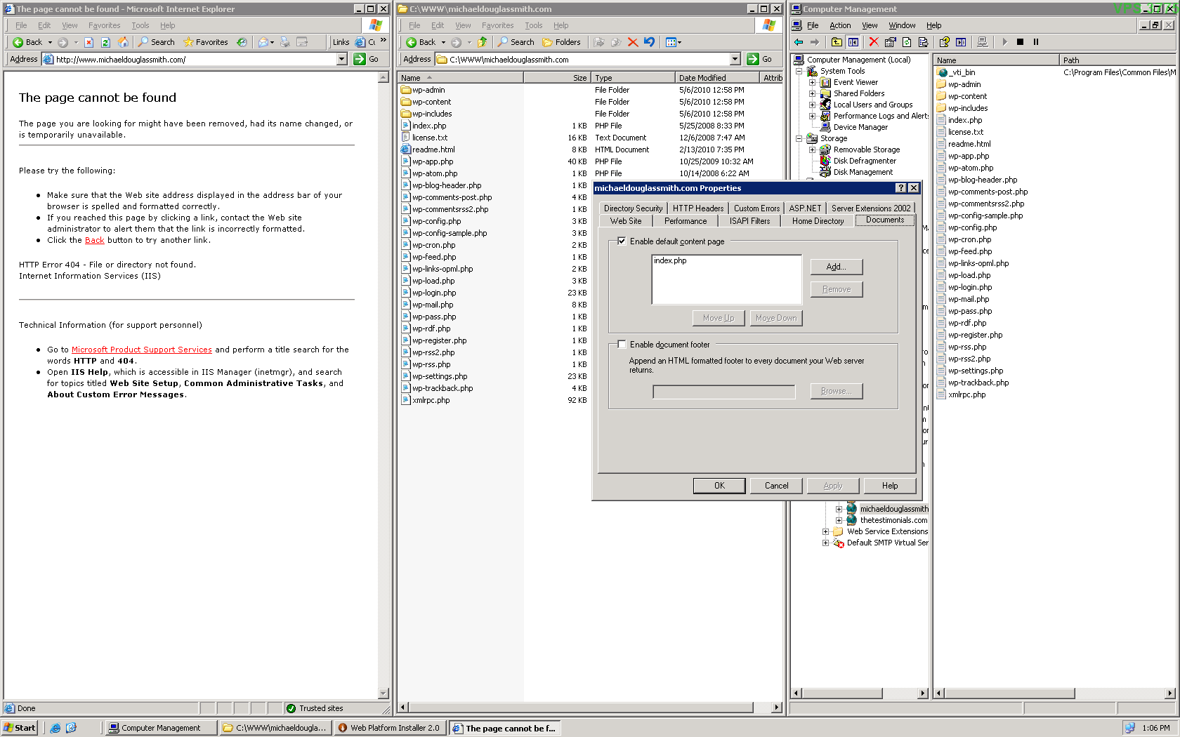 0 sbauer Posted May 7, 2010 Share Posted May 7, 2010 IIS 6.0 requires you to approve extensions before they can be executed, which is why you were seeing the 404 messages. I'm not familiar with the platform installer, but does it install PHP for you? If so, what DLL did the installer map .php to? (It's under the Home Directory tab > Configuration button) IIS 7 (Windows 7) is quite different from IIS 6. Saying it worked under Windows 7 is like saying it worked under IIS 3, but not IIS 6. Link to comment Share on other sites More sharing options...
