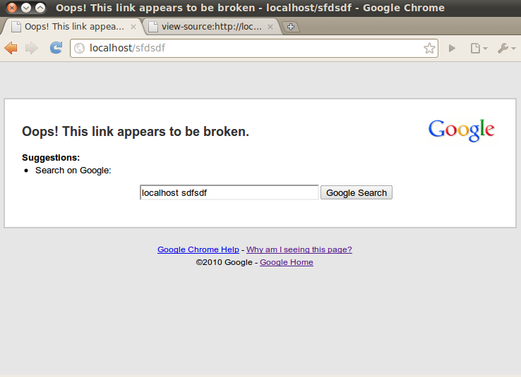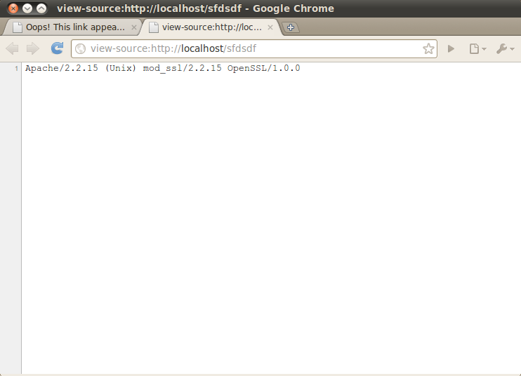 #!/usr/bin/perl print "Content-type: text/plain\n\n"; $server = $ENV{"SERVER_SOFTWARE"}; print $server;Problem is that in Chrome, it shows up as an error page, even though the HTML source is correct, as you can see in the following screenshots: