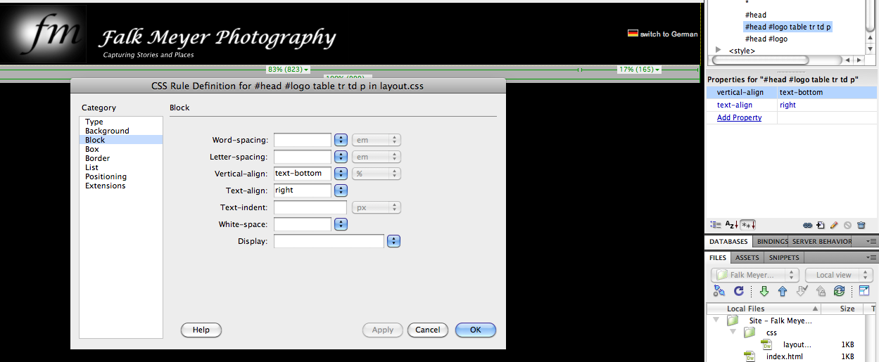 <!DOCTYPE html PUBLIC "-//W3C//DTD XHTML 1.0 Transitional//EN" "http://www.w3.org/TR/xhtml1/DTD/xhtml1-transitional.dtd"> <html xmlns="http://www.w3.org/1999/xhtml"> <head> <meta http-equiv="Content-Type" content="text/html; charset=UTF-8" /> <title>Falk Meyer Photography</title> <link href="css/layout.css" rel="stylesheet" type="text/css" /> <style type="text/css"> #flag { position:absolute; left:1096px; top:61px; width:117px; height:13px; z-index:1; } </style> </head> <body> <div id="head"> <div id="logo"> <table width="100%" border="0"> <tr> <td width="83%"><img src="site graphics/fmlogo.jpg" width="125" height="83" alt="Falk Meyer Photography Logo" /><img src="site graphics/fmlogo_textonly.gif" width="373" height="83" alt="Falk Meyer Photography Header Text" /></td> <td width="17%"><p><img src="site graphics/de_flag.gif" width="15" height="10" alt="de" /> switch to German</p></td> </tr> </table> </div> </div> </body> </html>I want de_flag.gif and " switch to German" to appear bottom aligned.