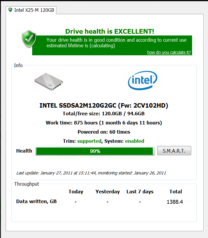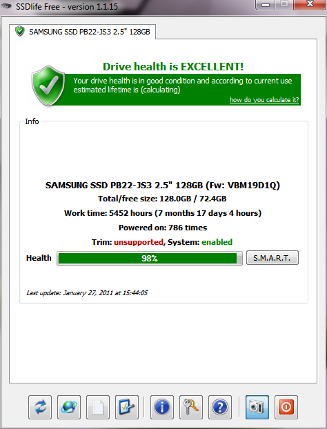 Salty Wagyu Posted January 27, 2011 Share Posted January 27, 2011 Still 99% here on the Intel X-25M, 9 months work time. No optimizations used other than what Windows 7 did during install (defrag&superfetch). Link to comment Share on other sites More sharing options...