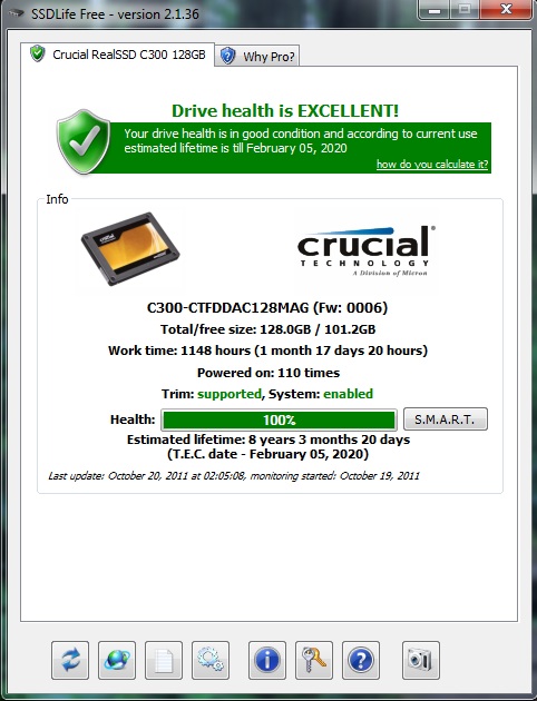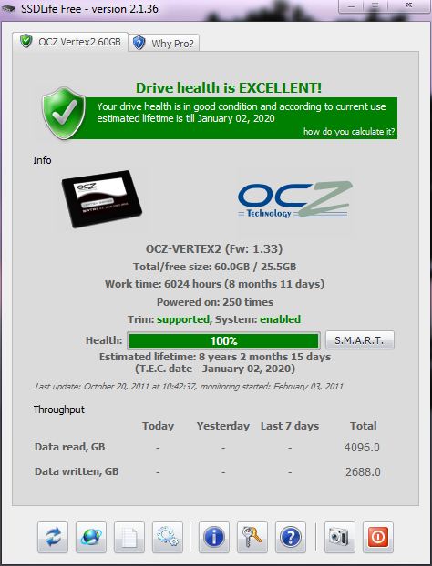 primexx Posted November 20, 2011 Share Posted November 20, 2011 Just noticed that the new Intel SSD toolbox has its own drive life estimate. Bought my Kingston SNV425-S2 64GB SSD in September 2010. January 2011 SSD is 4 months old Health is 85% Work time: 2 months, 6 days Powered on: 229 times September 2011 SSD is 12 months old Health is 62% Work time: 6 months, 1 day Powered on: 578 times "Your drive health is in good condition and according to current use, estimated lifetime is August 2020." October 2011 SSD is 13 months old Health is 59% Work time: 6 months, 15 days Powered on: 646 times "Your drive health is in good condition and according to current use, estimated lifetime is April 2020." November 2011 SSD is 14 months old Health is 56% Work time: 6 months, 28 days Powered on: 709 times "Your drive health is in good condition and according to current use, estimated lifetime is June 2020." that seems like awfully quick wear =S Link to comment Share on other sites More sharing options...