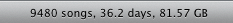 0 Nick H. Supervisor Posted February 14, 2011 Supervisor Share Posted February 14, 2011 5012 songs, just under 30GB. Apparently I could listen to music non stop for 14 days without hearing the same song twice...well, not quite since there are a couple of duplicates thanks to compilation albums. Link to comment Share on other sites More sharing options...
