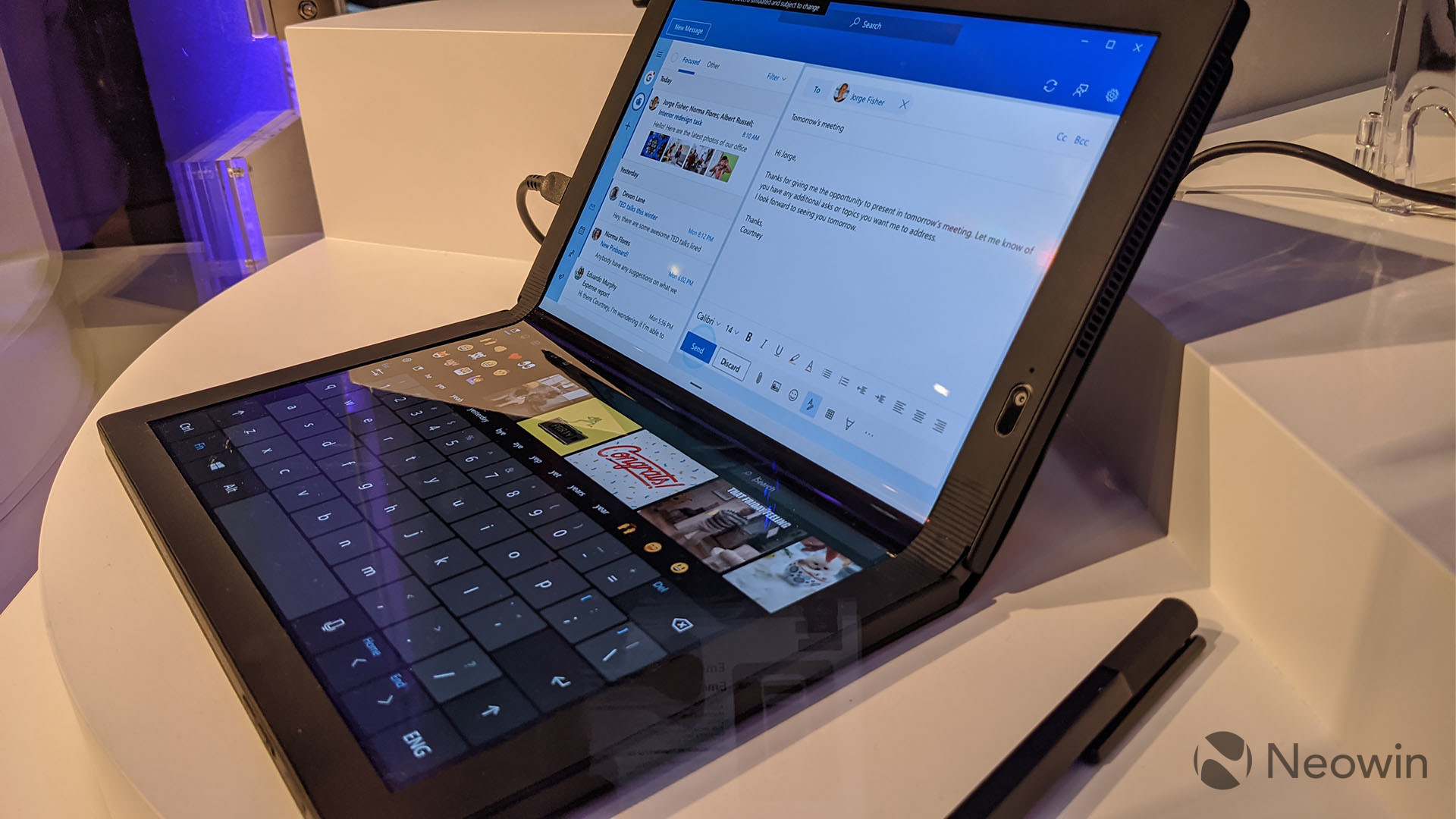 This above image was on the demo unit that was behind the glass, and it's what Windows 10X will look like when it's running properly on the ThinkPadX1 Fold. Another thing it will do is actually be able to tell when the magnetic keyboard is placed inside there, and adjust the OLED display accordingly. Windows 10 Pro can't do that.