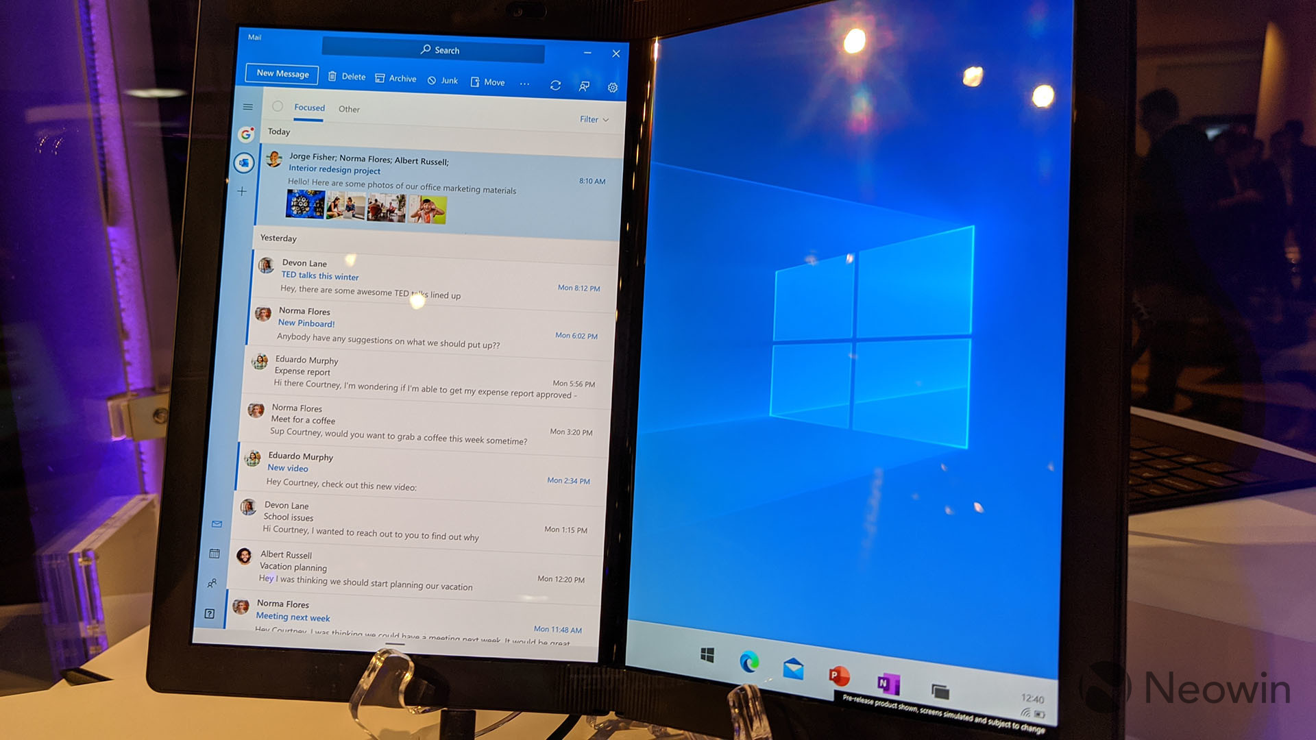 The version that I got to see is that was referred to as "vanilla" Windows 10X, or the one that you'll get to see on the Surface Neo. Honestly, there's not a whole lot to see. You can see the new Start Menu in the image above, but most of the apps are the same that you'll currently get on Windows 10. That Start Menu can be launched by clicking on the gray Windows icon, which turns blue after you press it. You can also access it by swiping up from the bottom of the screen, similar to how Chrome OS works.