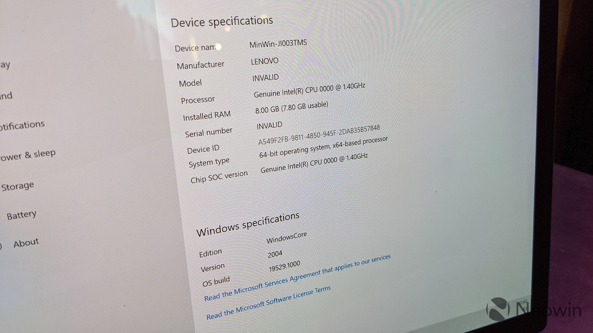 I did, of course, get a screenshot of the About page. The edition is WindowsCore, meaning Windows Core OS. There's no model number for the CPU, which is common for Intel products that haven't been formally announced yet, although it will be a Lakefield SKU.